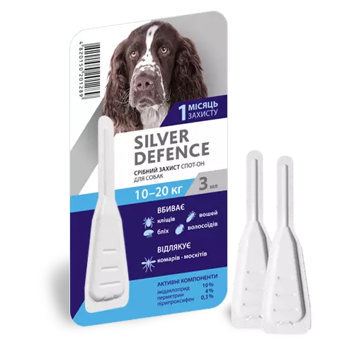 Капли на холку для собак Silver Defence - инсектоакарицидный препарат, который предназначен для уничтожения блох, иксодовых клещей, вшей и власоедов, паразитирующих на животных, защиты от нападения вышеупомянутых паразитов, комаров и москитов.