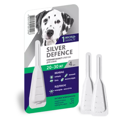 Капли на холку для собак Silver Defence - инсектоакарицидный препарат, который предназначен для уничтожения блох, иксодовых клещей, вшей и власоедов, паразитирующих на животных, защиты от нападения вышеупомянутых паразитов, комаров и москитов.
