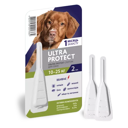 Капли на холку для собак Ultra Protect - инсектоакарицидный препарат, который предназначен для уничтожения блох, иксодовых клещей, вшей и власоедов, паразитирующих на животных, а также для защиты от заболеваний переносимых паразитами.