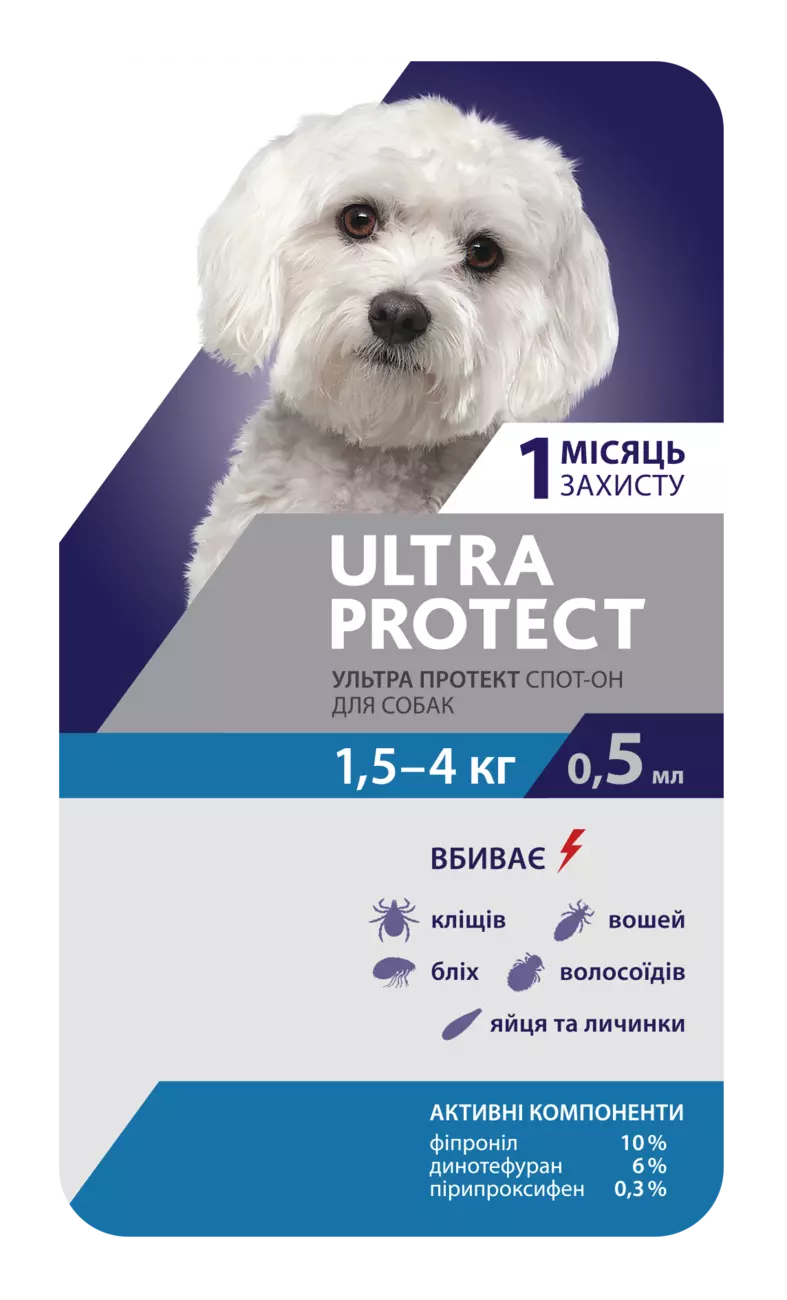 Капли на холку для собак Ultra Protect - инсектоакарицидный препарат, который предназначен для уничтожения блох, иксодовых клещей, вшей и власоедов, паразитирующих на животных, а также для защиты от заболеваний переносимых паразитами.