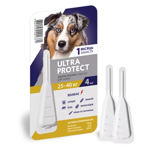 Капли на холку для собак Ultra Protect - инсектоакарицидный препарат, который предназначен для уничтожения блох, иксодовых клещей, вшей и власоедов, паразитирующих на животных, а также для защиты от заболеваний переносимых паразитами.